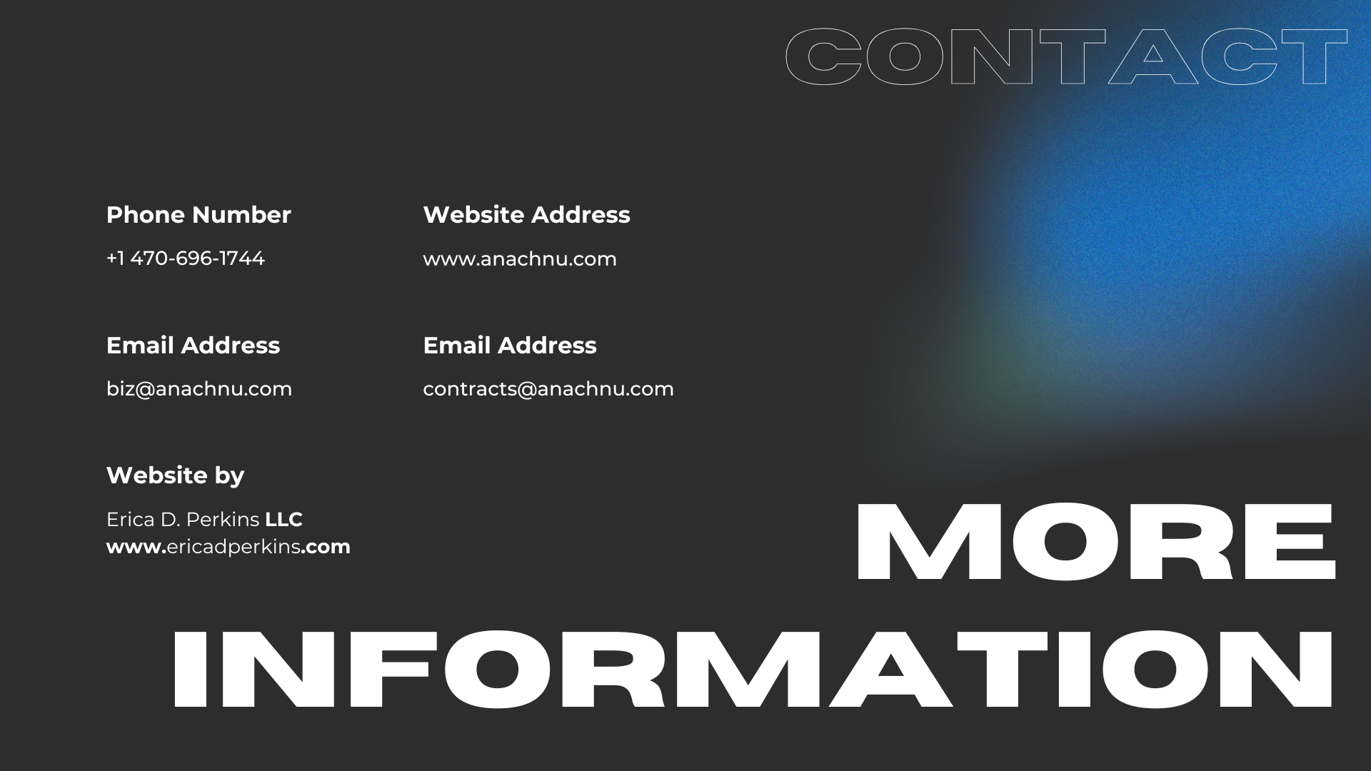 Infographic of the Anachnu.site landing page featuring the brand logo. Infographic explaining the problems companies face when finding contractors Infographic explaining solutions to the previously listed problems. Infographic explaining the three advantages Anachnu, Incorporated offers. Infographic explaining mobile optimization design approach. Infographic explaining the birth of the Anachnu brand. Infographic explaining the target markets for Anachnu, Inc. Infographic explaining more advantages Anachnu, Inc. offers their customers. Infographic containg contact information for Anachnu, Inc. including phone, email, and website.